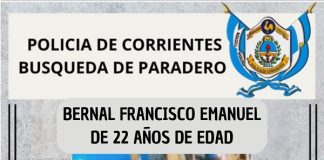 EL CIUDADANO BERNAL FRANCISCO EMANUEL DE 22 AÑOS DE EDAD, FUE LOCALIZADO SANO Y SALVO EN SANTO TOME, POR LO QUE SE DEJA SIN EFECTO EL PEDIDO DE BUSQUEDA...