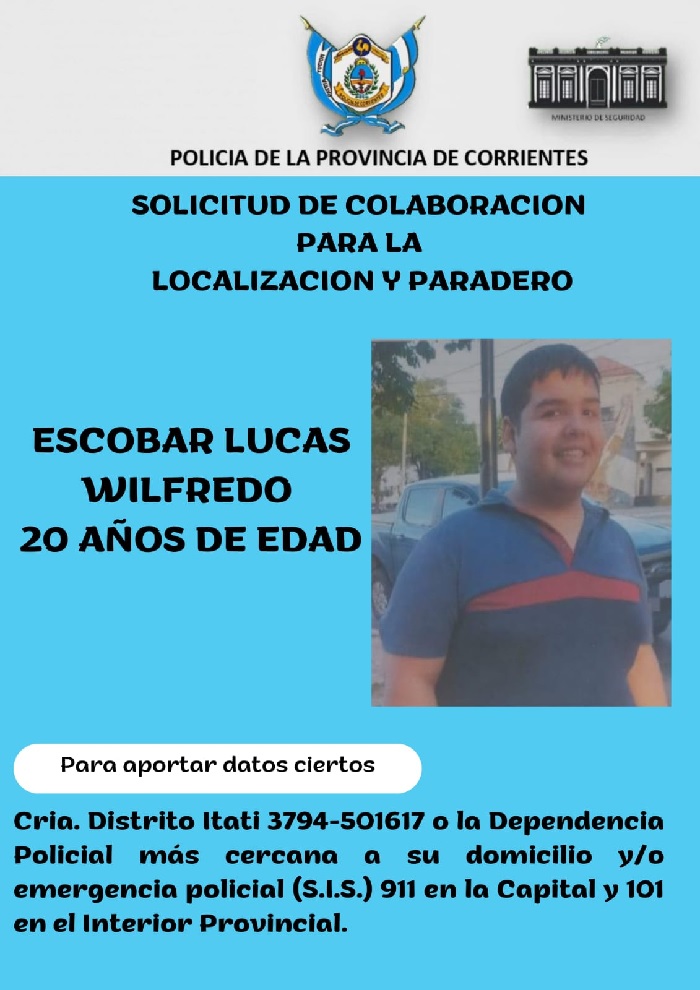 ESCOBAR LUCAS WILFREDO DE 20 AÑOS DE EDAD , quien conforme a la denuncia efectuada por una persona de apellido Escobar, el mismo se había ausentado desde el día 16-08-25, sin que hasta el momento se tenga novedades sobre su actual paradero, dando intervención de ésta situación al Juzgado en turno.