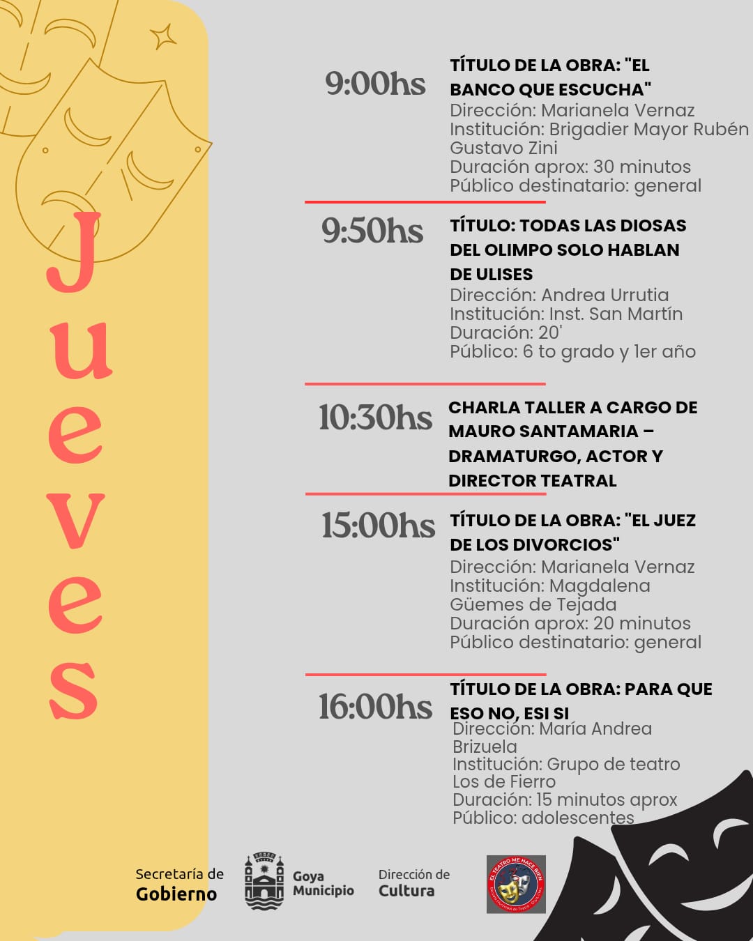 9,50 horas: “LAS DIOSAS DEL OLIMPO SOLO HABLAN DE ULISES”; del Instituto “San Martín”. Dirección: Andrea Urrutia. Duración: 20 minutos. Destinado al público estudiantil de 6° grado y 1º año.