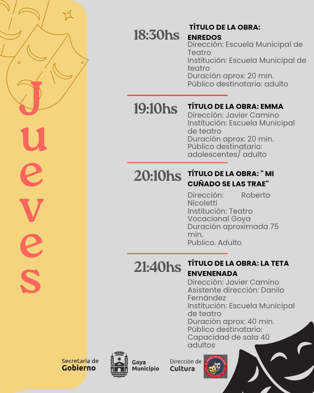 20,10 horas: “MI CUÑADO SE LAS TRAE”; del Teatro Vocacional Goya. Dirección: Roberto Nicoletti. Duración: 75 minutos. Destinada al público adulto.