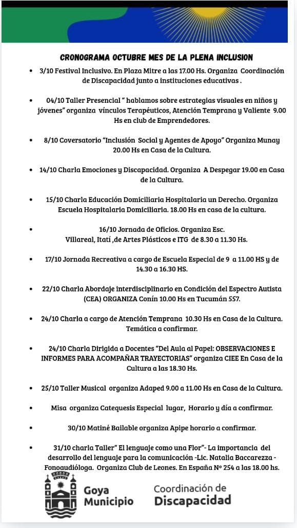 El festival programado para el viernes 3 de octubre da inicio a las actividades en adhesión al mes de la plena inclusión, elaboradas desde la Municipalidad de Goya por medio de la Coordinación de Discapacidad, junto a instituciones educativas, terapéuticas, asociaciones de padres de personas con discapacidad, catequesis especial, entre otras.