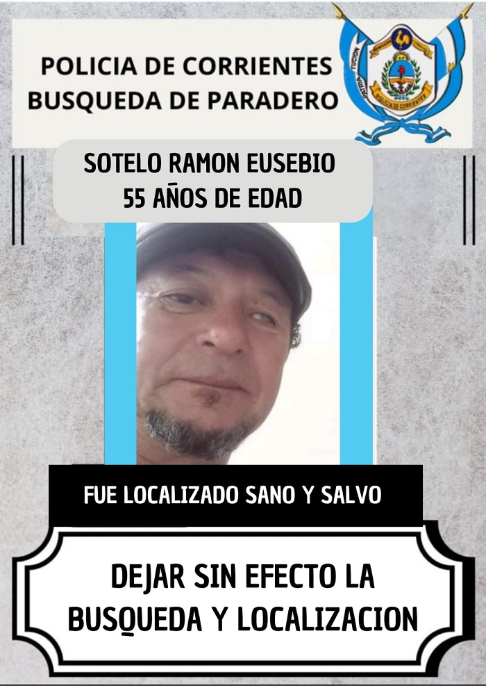 GOYA – – FUE LOCALIZADO SANO Y SALVO EN EL AMBITO DE DICHA CIUDAD EL CIUDADANO SOTELO RAMON EUSEBIO DE 55 AÑOS DE EDAD, POR LO QUE SE DEJA SIN EFECTO EL PEDIDO DE BÚSQUEDA DE PARADERO Y LOCALIZACIÓN DEL MISMO.