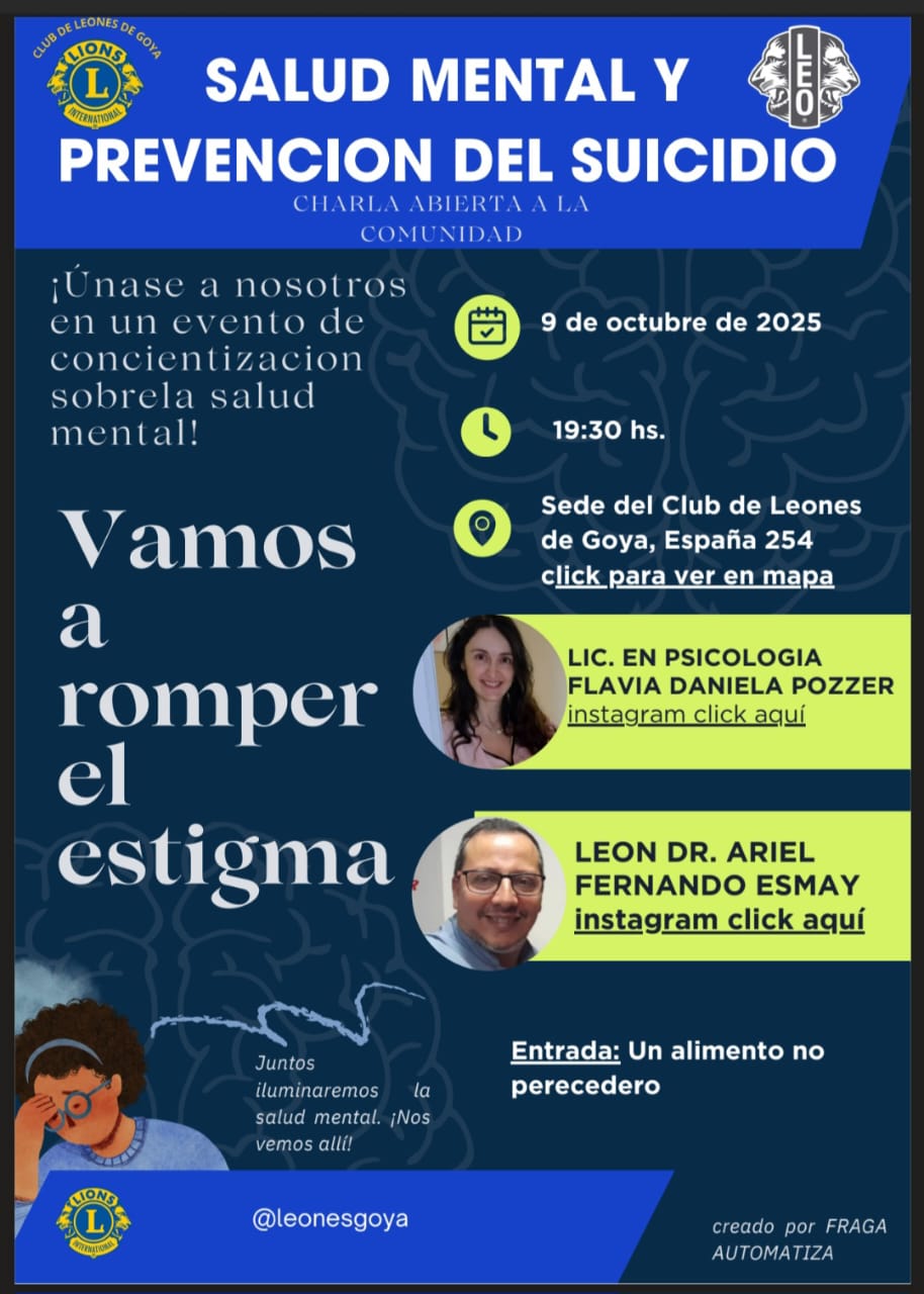 La primera charla de carácter abierta a la comunidad se concretará el 9 de octubre. “Vamos a romper el estigma” es la temática y versará sobre salud mental y prevención del suicidio. La charla es abierta a toda la comunidad. Se realizará el 9 de octubre a las 19:30 hs en la Sede del Club de Leones de Goya, España 254.