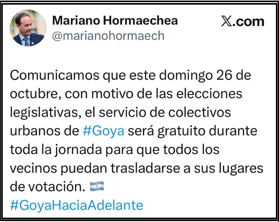 “Comunicamos que este domingo 26 de octubre, con motivo de las elecciones legislativas, el servicio de colectivos urbanos de Goya será gratuito durante toda la jornada para que todos los vecinos puedan trasladarse a sus lugares de votación y poder emitir su sufragio”, expresó el jefe comunal de nuestra ciudad.