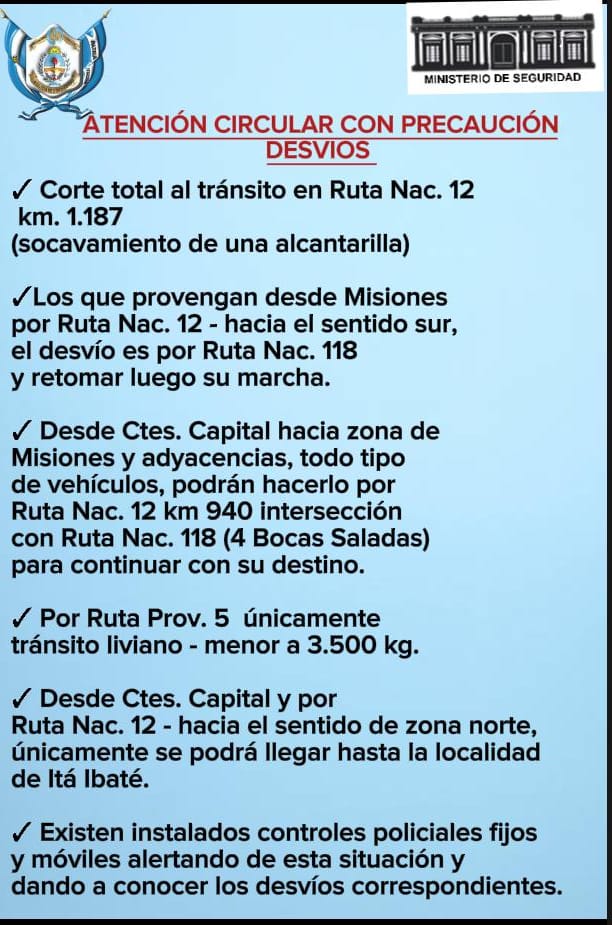 Por otra parte, los conductores de vehículos que transitan desde Posadas hacia Corrientes y/ó sur de la provincia, deberán hacerlo por la Ruta Nacional 118 hasta Saladas, donde podrán retomar nuevamente la Ruta Nacional 12 (a la altura del kilómetro 940 – Cuatro Bocas Saladas), y de ahí dirigirse hacia la capital de Corrientes, ó bien continuar por la misma en sentido sur.