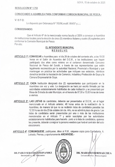 Mediante la Resolución N° 1.753, con las firmas del Intendente doctor Mariano Hormaechea y del Secretario de Gobierno doctor Pablo Fernández, el Departamento Ejecutivo de Goya convoca a las instituciones vinculadas al Concurso Nacional de Pesca del Surubí a participar de una Asamblea el próximo 28 de octubre a las 19:30, en el Salón de Acuerdos del D.E.M., con el fin de elegir a los nuevos integrantes titulares y suplentes de la Comisión Municipal de Pesca. Las listas de candidatos deberán presentarse hasta el 23 de octubre a las 12:30 horas.