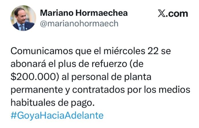 El Mandatario Local, en sus redes informó: “Comunicamos que el miércoles 22, se abonará el plus de refuerzo ($200.000) al personal de planta permanente y contratados por los medios habituales de pago.”