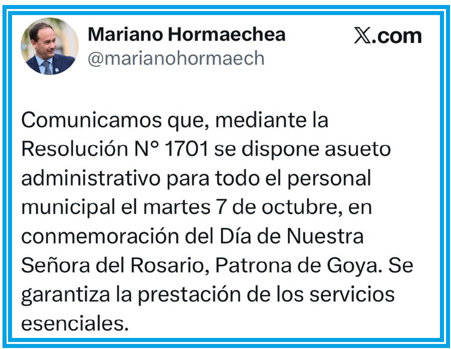 El jefe comunal Mariano Hormaechea manifestó: “Comunicamos que, mediante la Resolución N° 1701 se dispone asueto administrativo para todo el personal municipal el martes 7 de octubre, en conmemoración del Día de Nuestra Señora del Rosario, patrona de Goya. Se garantiza la prestación de los servicios esenciales”.