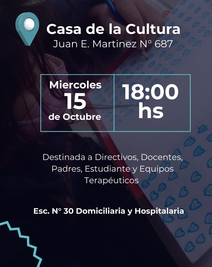 En la continuidad de las charlas, talleres por el Mes de la Plena Inclusión el miércoles 15 a las 19 horas, en Casa de la Cultura la Escuela Número 30 Domiciliaria y Hospitalaria, organiza una charla destinada a Directivos, Docentes, Padres, Estudiantes y Equipos Terapéuticos.
