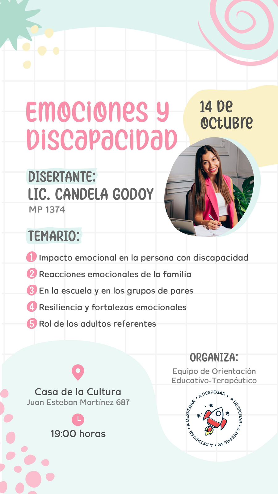 En ese sentido el Equipo de Orientación Educativo Terapéutico organiza para el martes 14 de octubre en Casa de la Cultura, a las 19 horas la disertación a cargo de la Lic. Candela Godoy; sobre “Emociones y Discapacidad”.