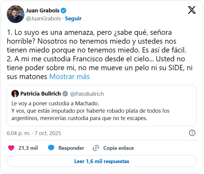 “Le voy a poner custodia a Machado. Y vos, que estás imputado por haberte robado plata de todos los argentinos, merecerías custodia para que no te escapes”, respondió Bullrich.