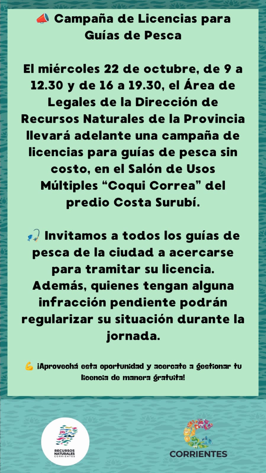 La Dirección de Recursos Naturales llegará con un equipo técnico y legal a Goya este miércoles 22. Estará durante todo el día en el Salón de Usos Múltiples “Coqui” Correa de Costa Surubí. Esta iniciativa, impulsada por el intendente Mariano Hormaechea, busca facilitar la regularización de guías de pesca y caza deportiva, operadores turísticos clave en la región.