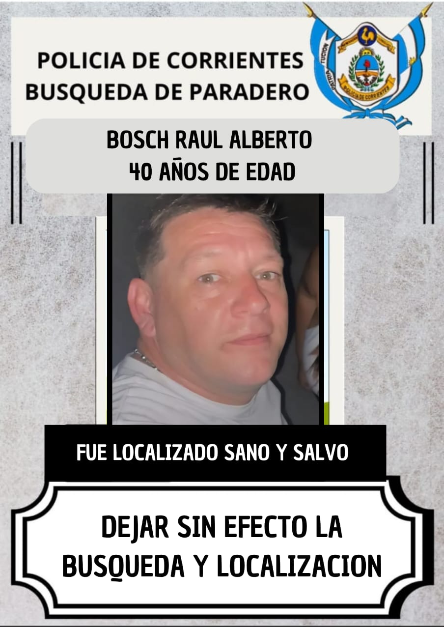 Por medio de esta gacetilla policial se agradece la colaboración de los distintos medios de comunicación y de la población en general y además se solicita DEJAR SIN EFECTO LA SOLICITUD DE PARADERO Y DE LOCALIZACION DEL CIUDADANO BOSCH RAUL ALBERTO DE 40 AÑOS DE EDAD, solicitado oportunamente por la Comisaría 19°, donde se radico la denuncia al respecto. Cabe señalar que el mismo fue localizado sano y salvo, y de cuya situación ya tomó conocimiento el denunciante. (Solicitud enviada oportunamente, desde este Departamento de Relaciones Institucionales mediante Gacetilla Policial).