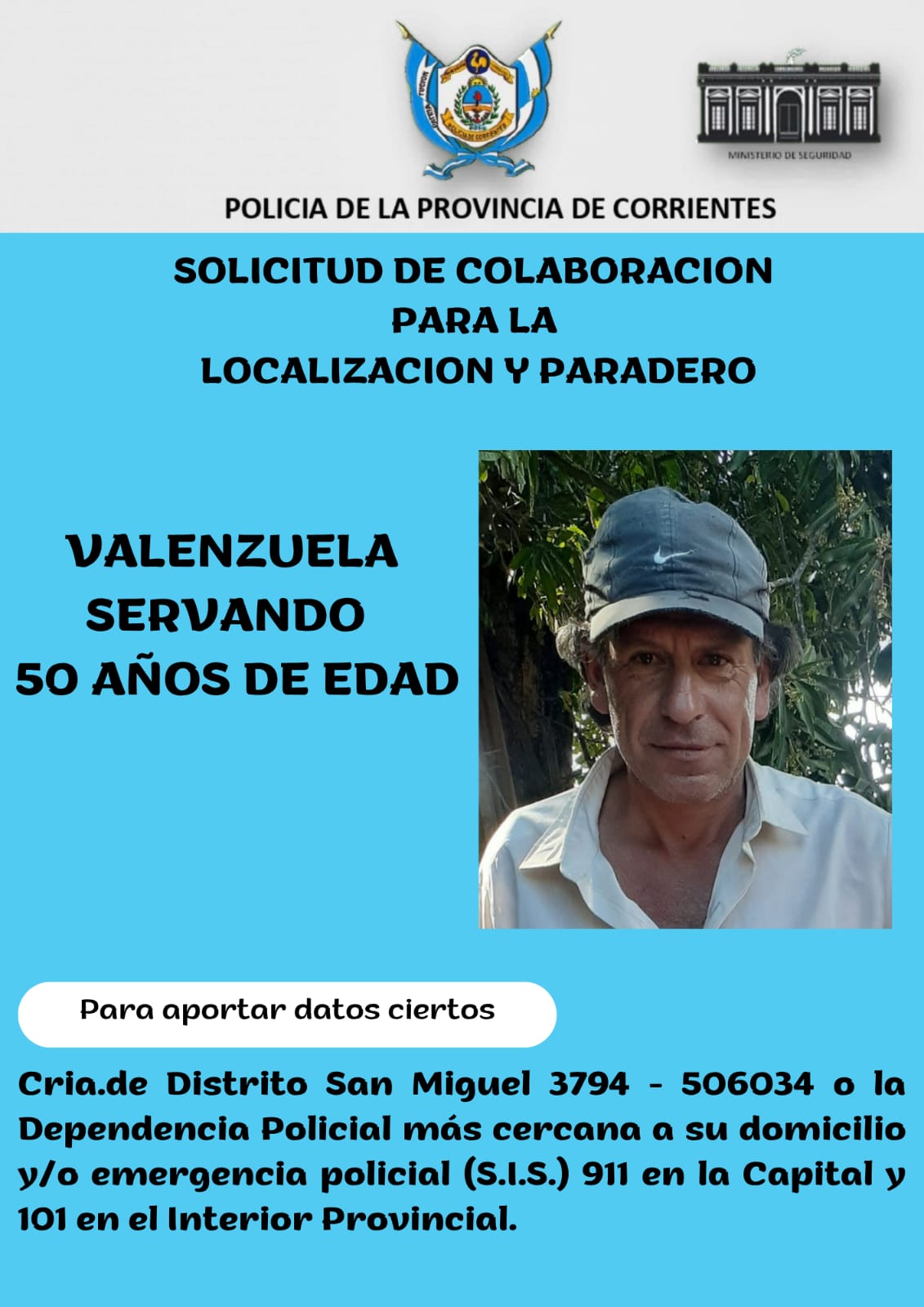 SAN MIGUEL – – A través de la presente Gacetilla, solicitamos a los distintos medios de comunicación pueda ser reflejado-publicado sobre una solicitud enviada desde la Comisaría de Distrito de San Miguel, el día de hoy 01-10-25, quienes solicitan la colaboración para dar difusión respecto a la búsqueda y localización del ciudadano identificado como VALENZUELA SERVANDO DE 50 AÑOS DE EDAD, quien conforme a la denuncia efectuada, el mismo se encuentra ausente desde la tarde de ayer, dando intervención de ésta situación también a la fiscalía de Investigación en turno.