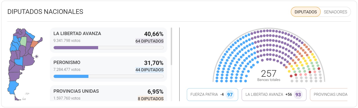 La Libertad Avanza (20), Fuerza Patria (28), Provincias Unidas (3), Provinciales (6), Otros (15). Total: 72.