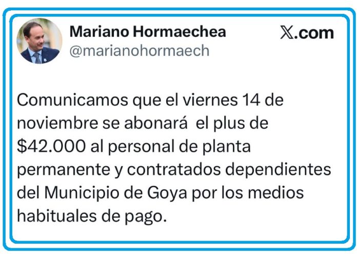 “Comunicamos que el viernes 14 de noviembre se abonará el plus de $42.000 al personal de planta permanente y contratados dependientes del Municipio de Goya por los medios habituales de pago”, expresó el primer mandatario de Goya, doctor Mariano Hormaechea.