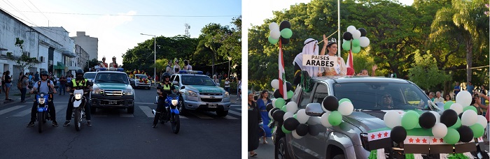 Cada país representado el recorrido desde el centro de la ciudad hasta el Multiespacio Ferial, lo hizo con sus reinas y embajadores, los elementos identificatorios de sus raíces, banderas, atuendos, accesorios despertando el interés de los transeúntes al paso de la multicolor caravana, por las calles de la ciudad, con un dispositivo dispuesto por la Dirección de Tránsito para acompañar el circuito fijado.