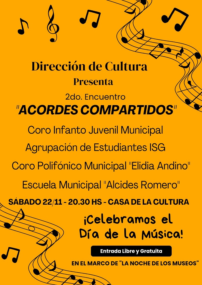 “En esa noche, la Casa de la Cultura va a tener un encuentro coral y alumnos de la escuela de música que estarán dando un colorido especial a la propuesta, teniendo en cuenta que el 22 de noviembre es el día de la música”, destacó Zampar.