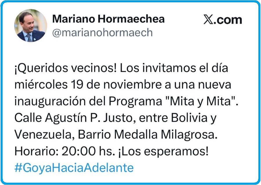 El intendente de Goya, Mariano Hormaechea, invita a los vecinos a participar este miércoles 19 de noviembre, a las 20 horas, de una nueva inauguración de calle de hormigón armado ejecutada en el marco del exitoso Programa “Mita y Mita”.