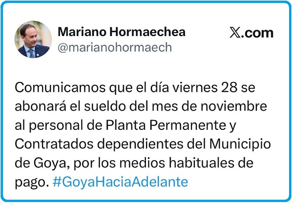 El jefe comunal de Goya, doctor Mariano Hormaechea: “Comunicamos que el día viernes 28 se abonará el sueldo del mes de noviembre al personal de Planta Permanente y Contratados dependientes del Municipio de Goya, por los medios habituales de pago. #GoyaHaciaAdelante