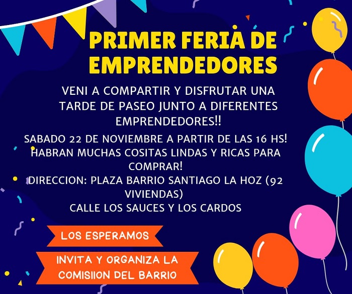 La jornada se desarrollará en la Plaza del Barrio Santiago La Hoz (92 Viviendas), ubicada en la intersección de Calle Los Sauces y Los Cardos, donde distintos emprendedores presentarán una amplia variedad de productos. Habrá “muchas cositas lindas y ricas para comprar”, desde propuestas artesanales hasta opciones gastronómicas para degustar en familia.