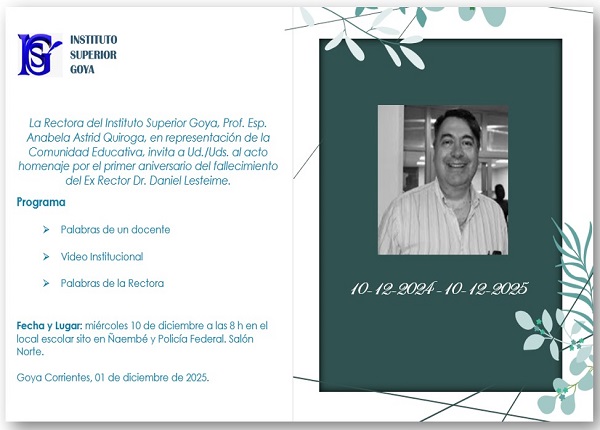 La Rectora del ISG Profesora Anabela Quiroga invita a participar del acto homenaje por el primer aniversario del fallecimiento del Ex Rector Dr. Daniel Lesteime.