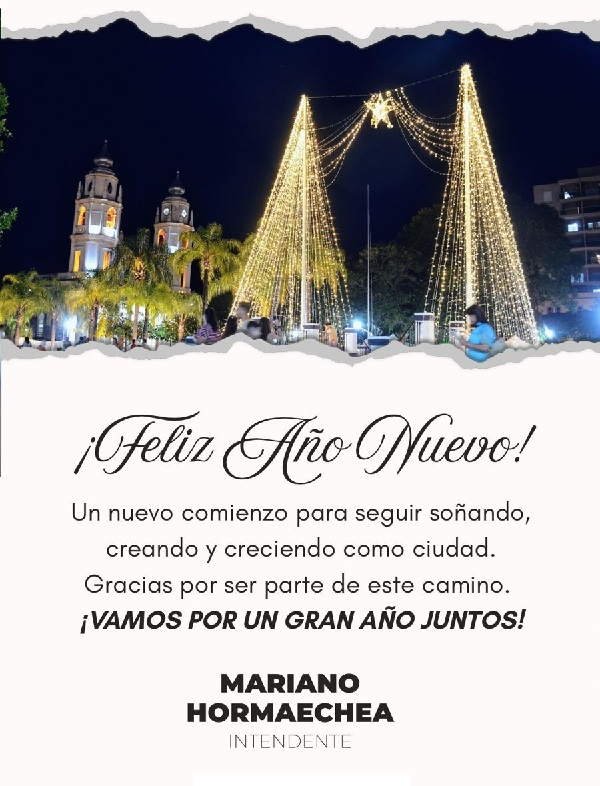 El Departamento Ejecutivo Municipal, hace llegar un afectuoso saludo a nuestros vecinos del campo y la ciudad, deseándoles lo mejor en el año que comenzamos a transitar. Reconociendo haber cumplido objetivos y superado momentos y situaciones contribuyendo en equipo a lograr resultados de superación, a las mujeres y hombres comprometidos con Goya.