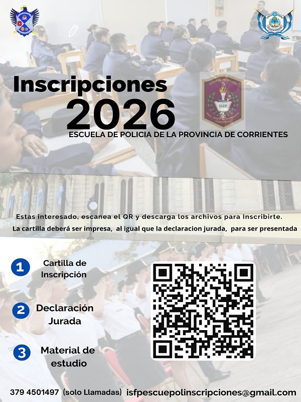 A partir del 11 de diciembre del 2025, al 30 de diciembre del 2025, se encuentra abierta la Inscripción para los postulantes de ambos sexos, como aspirantes a cadetes de la “ XVI° Promoción de Técnico Superior en Seguridad Pública y Ciudadana – LVII de Oficiales de Policía”, de una duración de 4 años, en la División Escuela de Policía “Gral. José Francisco de San Martín”, dependiente del Instituto Superior de Formación Policial.