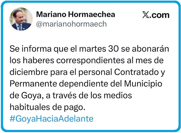 El Intendente de Goya, doctor Mariano Hormaechea, anunció a través de sus redes personales que este martes 30 de diciembre de 2025 se efectuará el pago de sueldos correspondientes al mes de diciembre para el personal de planta permanente y contratados de la Municipalidad de Goya.