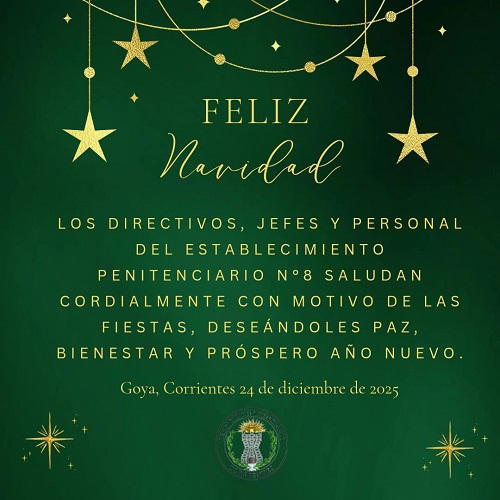 Los Directivos, Jefes y Personal del Establecimiento Penitenciario Número 8, saludan cordialmente con motivo de las fiestas, deseándoles Paz, Bienestar y próspero Año Nuevo