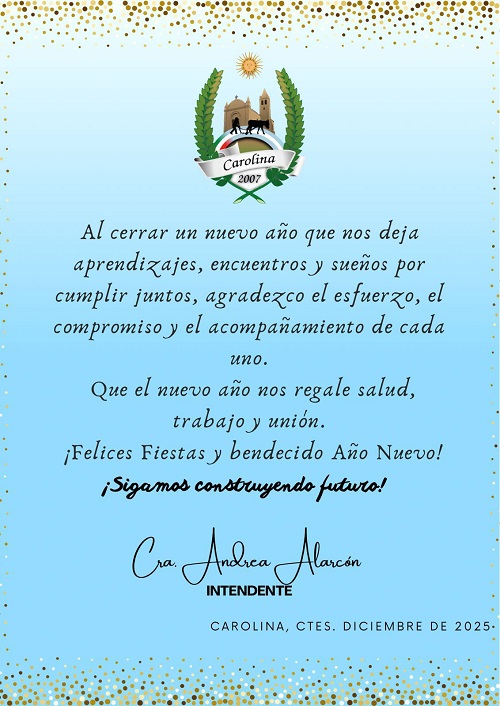 La Intendente de la Municipalidad de Carolina, Andrea Alarcón, en su saludo por las fiestas, manifiesta: Al cerrar un nuevo año que nos deja aprendizajes, encuentros y sueños por cumplir juntos, agradezco el esfuerzo, el compromiso y el acompañamiento de cada uno.