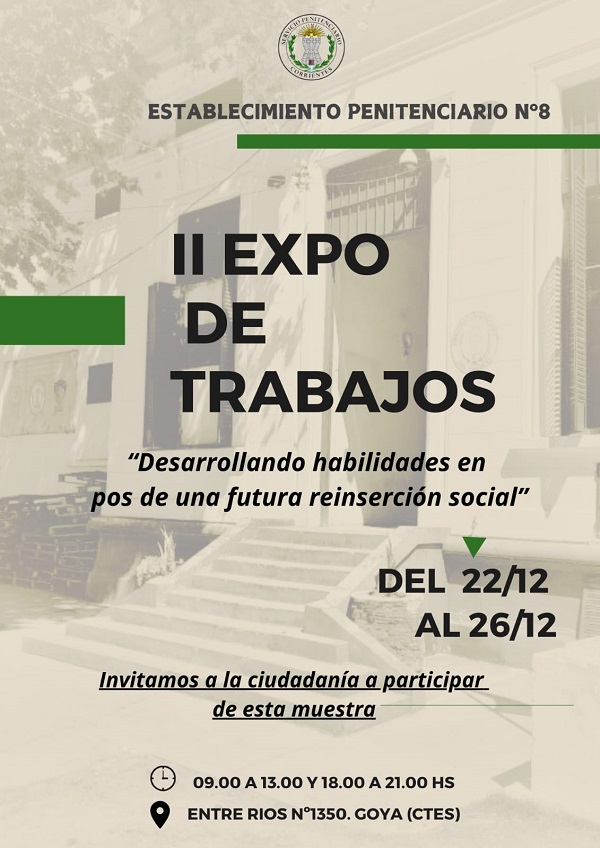 La muestra de los trabajos realizados por Personas Privadas de la Libertad alojados en el Establecimiento Penitenciario Nº8, se llevará a cabo desde el 22 al 26 de diciembre en las instalaciones de la unidad sita en calle Entre Ríos 1350 de esta ciudad, de 09.00 a 13.00 hs y de 18.00 a 21.00 hs.
