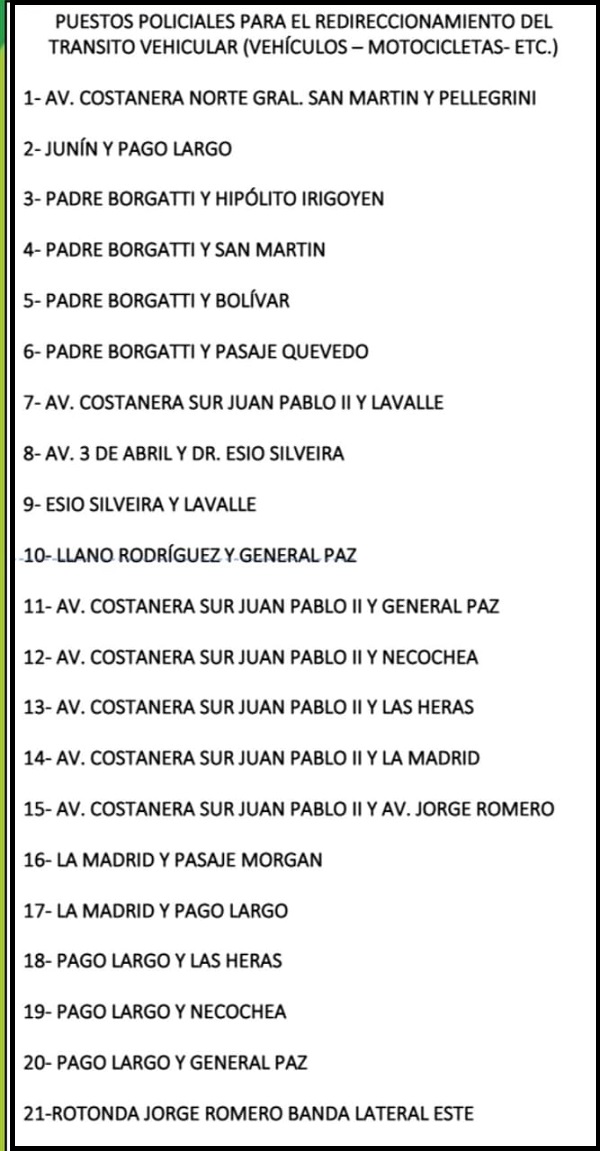 Los días 24 y 31 de diciembre de 2025 en la Costanera “General San Martín”, “Juan Pablo II”, desde las 23:00 hasta las 07:00 horas del día siguiente, se implementará un servicio especial de Blindaje.Para ello, se RESTRINGIRA el ingreso de todo tipo de vehículos, disponiéndose para ello, puestos policiales vallados en el perímetro próximo a ambas costaneras, NO SE PERMITIRA (a la zona de ambas costaneras) el ingreso de bebidas alcohólicas, ni botellas de vidrio u otros objetos que puedan ser utilizados para dañar la integridad física de otra persona y así también evitar cualquier alteración del orden público.
