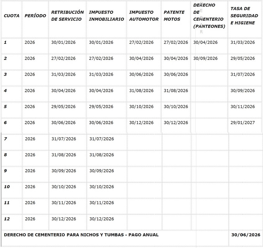 FIJANDO CALENDARIO IMPUESTOS AUTOMOTOR, INMOBILIARIO, RETRIBUCIÓN DE SERVICIOS ,PATENTE MOTOS, TASA SEGURIDAD E HIGIENE Y DERECHO CEMENTERIO – AÑO 2026