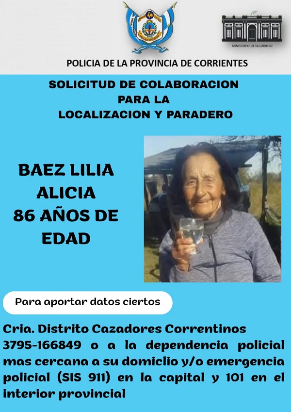 Cabe mencionar que efectivos policiales dependientes de la Unidad Regional III Curuzú Cuatia junto a otras áreas se encuentran realizando labores operativas en la zonas y adyacencia, es por ello, que independientemente de la esta labor de búsqueda que están realizando, se solicita la colaboración a los distintos medios periodísticos para su publicación y de esa manera dar a conocer a la población en general, para que aquellas personas que puedan aportar datos ciertos y que ayuden a lograr encontrar a esta ciudadana, puedan hacerlo ante la citada Comisaría nro. 3795-166849; o la Dependencia Policial más cercana a su domicilio y/o comunicarse al número telefónico gratuito del Sistema Integral de Seguridad (S.I.S.) 911 en la Capital y 101 en el Interior Provincial.