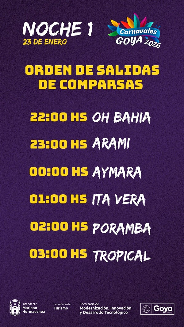 La invitación para vivir la alegría y la pasión del carnaval en el escenario para que los comparseros demuestren sus habilidades, sus esplendorosos trajes con el acompañamiento del público, en ese sentido se dio a conocer el cronograma de la primera noche de los corsos oficiales, recordando que la Agrupación Oh Bahía abrirá el recorrido por el circuito durante las 4 noches de carnaval.