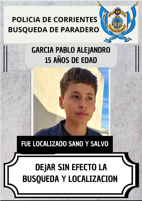 Por medio de esta gacetilla policial se agradece la colaboración de los distintos medios de comunicación y de la población en general y además se solicita DEJAR SIN EFECTO LA SOLICITUD DE PARADERO Y DE LOCALIZACION DEL MENOR GARCIA PABLO ALEJANDRO DE 15 AÑOS DE EDAD , solicitado oportunamente desde este Departamento de Relaciones Institucionales. Cabe señalar que el mismo fue localizado sano y salvo.