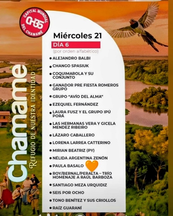 Este miércoles, en el “Sexto Sapucay”, Paula Basalo subirá al escenario Osvaldo Sosa Cordero en un ensamble profundamente “enchamigado”, junto a músicos de Goya y la región. La acompañarán Rubén Olmedo en guitarra, Pedro David Ojeda en bajo, César “Tuki” Ortiz en acordeón y Silvio Domínguez en percusión y caja peruana. Una formación que define como una banda esquinense-goyana.