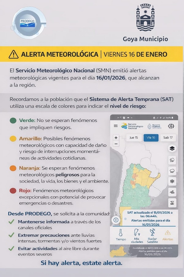 Se solicita la comunidad mantenerse informada a través de los canales oficiales, extremar precauciones ante lluvias intensas, tormenta y o viento fuerte evitar actividades al aire libre durante eventos severos. Desde el PRODEGO solicitaron evitar sacar residuos domiciliarios.