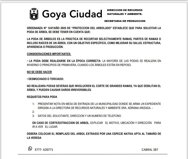 La Dirección de Recursos Naturales y Medio Ambiente de la Municipalidad de Goya, recuerda la Vigencia de la Ordenanza 1247/2005; a través de la cual se establece y dispone las condiciones para solicitar la poda de árboles.