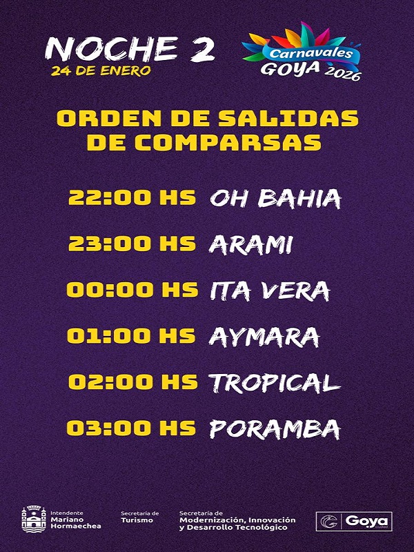 Este es el orden establecido para la segunda noche de los corsos oficiales de nuestra, ciudad, el sábado 24 de enero: