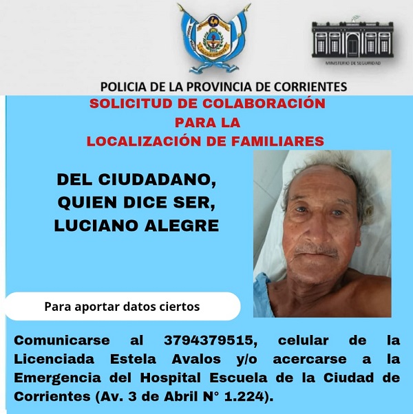 Por ello, personal del Hospital Escuela solicita la colaboración de la población, quien tenga datos sobre familiares del mismo a fin de acercarse hasta el lugar (Avenida 3 de Abril 1.224 de esta ciudad capital) o comunicarse al celular 3794-379515 (Lic. Estela Avalos)