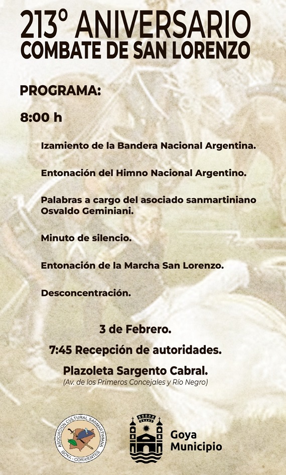 La Municipalidad de Goya y La Asociación Cultural Sanmartiniana Goya al acto conmemorativo del bautismo de fuego de los Granaderos a caballos, comandado por San Martin