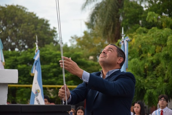 El solemne acto se inició con el izamiento del pabellón nacional, a cargo del secretario de Gobierno Fernández, el teniente coronel Ortiz y la profesora Báez. El momento estuvo acompañado por el toque ceremonial del sargento trompeta Daniel González, del Batallón de Ingenieros de Monte 12, tras lo cual se entonaron las estrofas del Himno Nacional Argentino.
