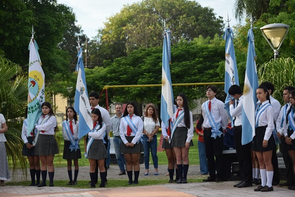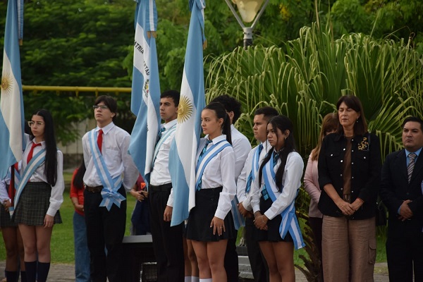 libertad, unión y compromiso. El acto se desarrolló en la plaza Plácido Martínez, en un marco de profundo sentimiento patriótico, evocando aquel 27 de febrero de 1812 cuando el general Manuel Belgrano enarboló por primera vez la enseña celeste y blanca a orillas del río Paraná.