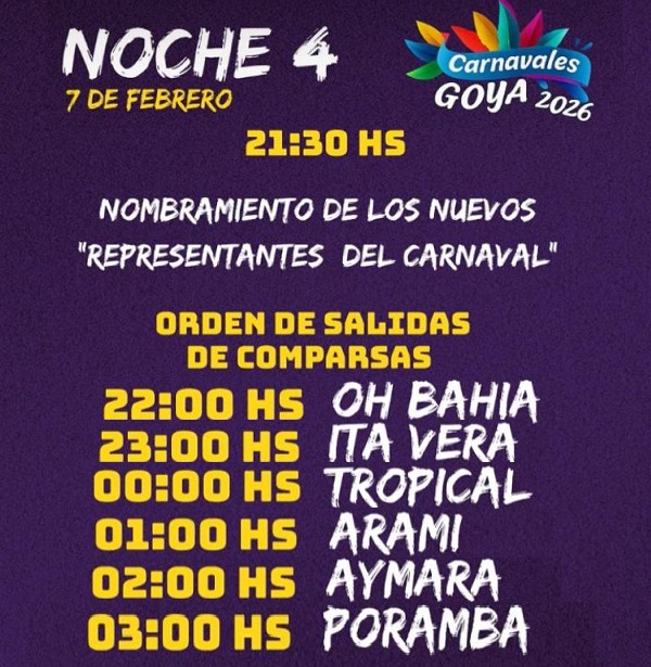 tanto que a las 22 comenzará el desfile de las comparsas que animaron durante estos fines de semana el carnaval en Goya. Abrirá Oh Bahía y seguirán Ita Vera, Tropical, Arami, Aymará y Poramba.