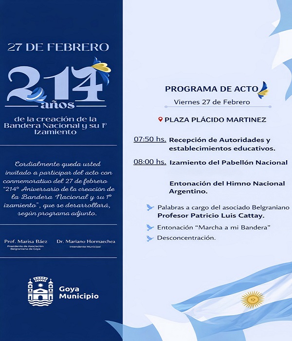 La Municipalidad de Goya conjuntamente con la Asociación Belgraniana invitan a participar del acto conmemorativo por los 214 años de la creación de la Bandera Nacional y su primer izamiento, que se llevará a cabo este viernes 27 de febrero en Plaza Plácido Martínez de la ciudad de Goya.