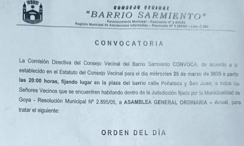 La Comisión Directiva del Consejo Vecinal del Barrio Sarmiento CONVOCA, de acuerdo a lo establecido en el Estatuto del Consejo Vecinal para el día miércoles 25 de marzo de 2026 a partir las 20:00 horas, fijando lugar en la plaza del barrio calle Peñaloza y San Juan; a todos los Señores Vecinos que se encuentren habitando dentro de la Jurisdicción fijada por la Municipalidad de Goya – Resolución Municipal N° 2.895/05, a ASAMBLEA GENERAL