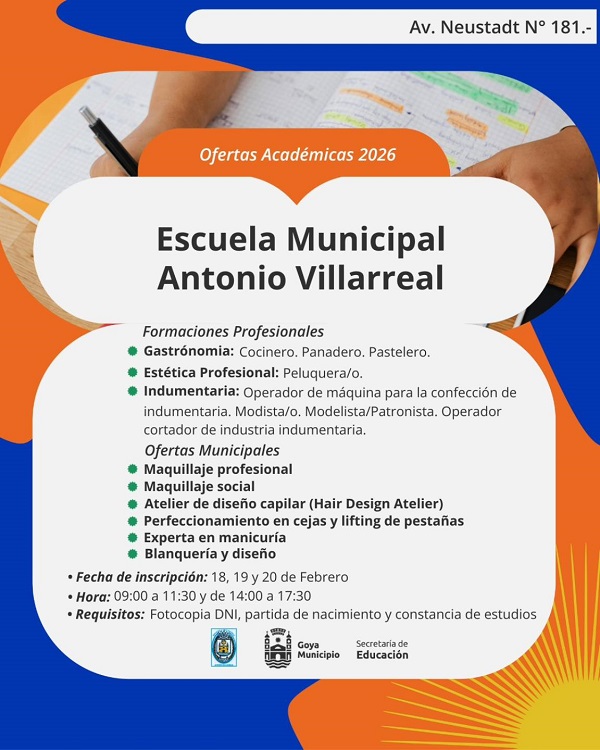 Las Escuelas Municipales “Antonio R Villarreal” y “Nuestra Señora de Itati” habilitan desde el próximo miércoles 18 y hasta el 20 de febrero el periodo de inscripción para los distintos cursos que dictará durante el ciclo lectivo 2026.