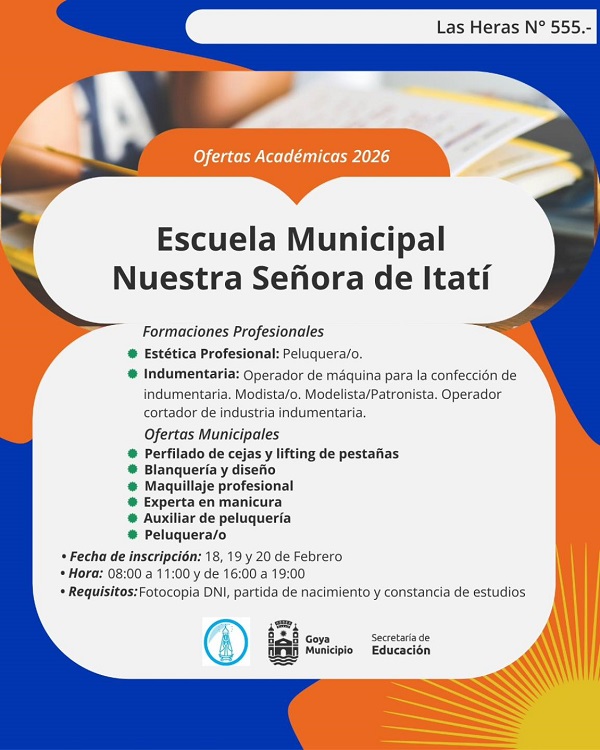 Por su parte la escuela ubicada en el Barrio Itatí, en calle Las Heras 555, abre las inscripciones para las ofertas educativas profesionales y municipales desde el miércoles 18 al viernes 20 de febrero en los siguientes horarios: por la mañana de 08:00 a 11:00 o por la tarde de 16:00 a 19:00 hs.
